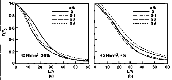 Fig. 7. Relationship between slender column capacity L/h and short e column ‘squash’ capacity P/P0 for: (a) 80 N/mm², r = 0.8%; and (b) 80 N/mm², r = 4%