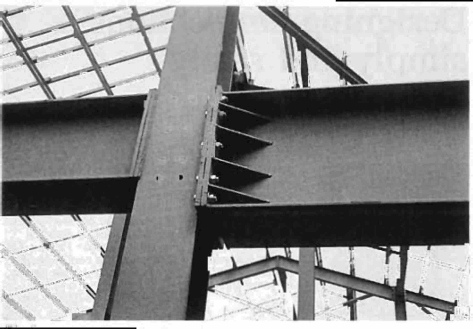 Connection design has an influence on safety out of all proportion to the cost of the items involved, so problems in this area demand particular attention from the profession. Recent research confirms the view that all is not well. Davies & Morris [1] commissioned an experienced portal frame manufacturer to design and build a frame and this was then test loaded .The all-important haunch connection began to fail at only slightly above the design working load. The mode of failure indicated that certain basic aspects of the structure had simply not been checked and later examination showed extensive yielding in several areas not involved in the actual failure. Distress in these areas at a load well below the supposed capacity of the assembly suggests that the design was inadequate in more ways than one (Fig 4).