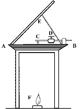 ‘An apparatus for observing the motions of waves excited, in a fluid poured into the trough AB, by the vibrations of the elastic wire C, loaded with the movable weight D; the shadow of the waves being thrown on a screen E and by the lamp F, through the bottom of the trough, which is of glass’.