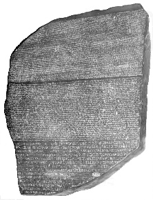 The second (Fig. 2) is the Rosetta Stone: an engraved stone from Egypt, dated to 196 BC. It caused a sensation when it was discovered in 1799, because it appeared to have a message inscribed on it in three languages: the bottom section in Greek, the middle in an old Egyptian script and the top part in ancient Egyptian hieroglyphs. The Rosetta Stone was seen as the key which would allow scholars to crack the code of the hieroglyphs and read the hieroglyphic inscriptions that had been found on monuments around the country. The code was eventually broken and the first hieroglyphics were translated by a man named Young.